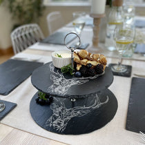 Bring a refined touch to afternoon tea and dessert time with our 2 tier serving stand. Made from our signature hand crafted slate and engraved with a beautiful pheasant or stag design.