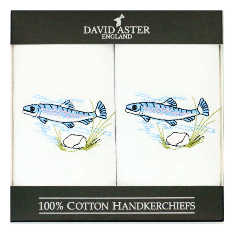 Dalaco Fish Embroidered White Cotton Handkerchiefs.100% cotton, this set is supplied in a smart eco-friendly card gift box as a pair.