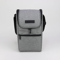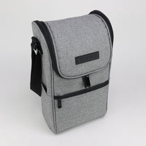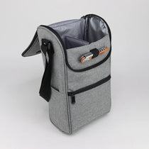 This wine bottle cooler bag is engineered to keep your wine chilled for up to twelve hours. It boasts two soft and insulated main compartments, a bottle opener, and a front pocket with a zipper for holding additional items like ice or gel packs. The bag's carry strap makes it effortless to transport while on the go. Holds up to two wine bottles. Crafted from polyester with PEVA trims. For maintenance, simply use a sponge and water to clean.