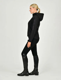 The Dublin Scarlett Soft Shell Bonded Jacket is a lightweight smart and elegant short waterproof coat made from a triple layer fabric with TPU membrane and bonded fleece to keep you warm. This lightweight soft shell jacket is designed to be slightly elasticated so it moves with you, making this an ideal coat being active at the yard or when riding. With a full centre double ended waterproof zip and waterproof zip pockets this is perfect to keep you and your belongings warm and dry! The elasticated draw cord around the hem helps to keep you warm, removable hood with draw cord for versatility. With Rain guard sleeve tabs and Dublin branding on the chest and left sleeve. This jacket is a firm favourite for your winter wardrobe. Available in Ladies XS to XL. Curve sizes also available.